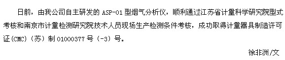 公司喜獲ASP-01型煙氣分析儀制造計量器具許可證