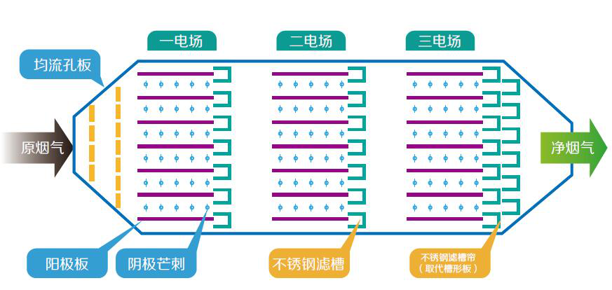 導電濾槽技術是在不改變電除塵器體積和阻力的前提下,在電除塵器各個電場末端收塵板后增設導電濾槽,有效吸附和過濾收塵板表面逃逸的粉塵,對高比電阻粉塵不會產生反電暈,同時大大減少二次揚塵,使煙塵濃度明顯下降。