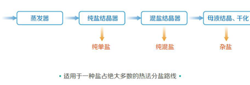 當廢水中氯化鈉和硫酸鈉比例相差不大時,可采用硫酸鈉和氯化鈉分步結晶的方式,蒸發器濃水先結晶硫酸鈉,母液通過冷凍進一步結晶十水硫酸鈉,冷凍結晶器排水中氯化鈉占絕大多數,通過氯化鈉結晶器制備氯化鈉,少量母液采用結晶或干化形成雜鹽。