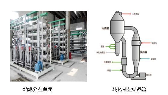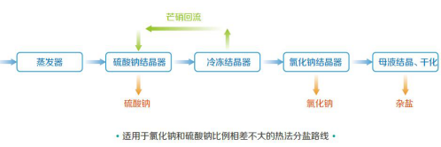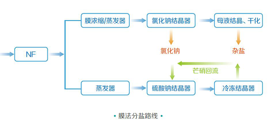 當廢水中氯化鈉比例占優勢時,還可以采用膜法工藝,通過納濾截留硫酸鈉,納濾產水進一步蒸發濃縮后結晶氯化鈉,納濾濃水蒸發濃縮后,先結晶硫酸鈉,再冷凍結晶十水硫酸鈉。少量母液采用結晶或干化形成雜鹽。