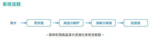 廢水首先進入蒸發器蒸發濃縮,濃水和惰性物質摻混進入高溫分解爐進行熱解處理,有機物在熱解爐分解,結晶鹽重新溶解后進入結晶器進一步提純,制備可以資源化利用的結晶鹽。