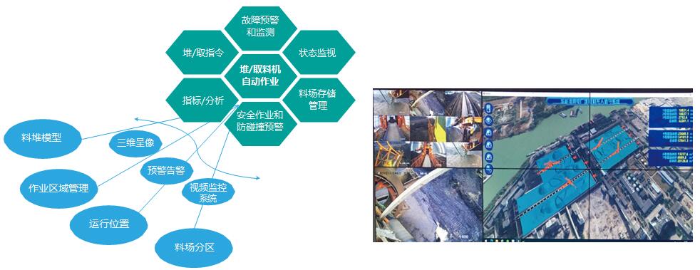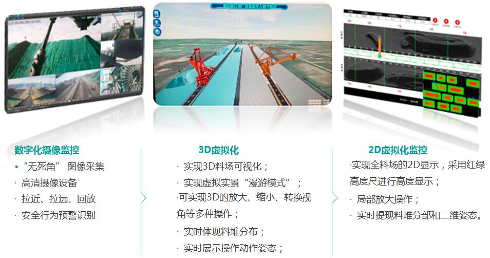 自動通過傳感器實時建立堆取料工作三維狀態場景,智能化精準調度指揮控制作業,實時和模型對比調控