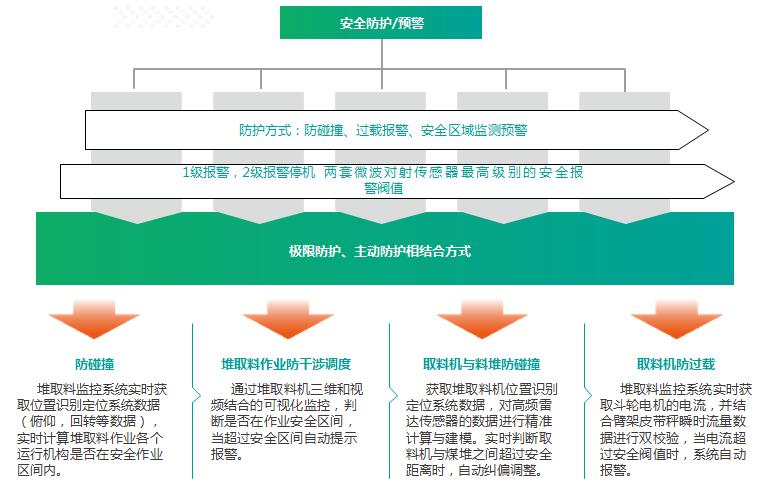 包括編碼器以及冗余的位置測量,精準定位堆取料姿態,安裝激光、雷達、紅外對射等物聯網感知,集成數字化攝像等信息