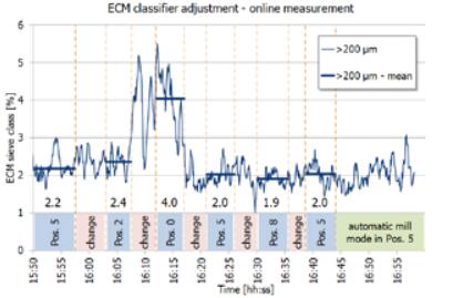 有了煤粉細度分析儀以后,就能實時優(yōu)化煤粉細度,從而改善燃燒并降低飛灰含碳量。采用磨煤機的分離器可以調(diào)節(jié)煤粉的細度。在調(diào)節(jié)和檢測煤粉細度時,要用煤粉細度分析儀進行連續(xù)測量,由此很容易獲得最優(yōu)的磨煤機設(shè)定值。右圖的測量結(jié)果說明煤粉細度儀具有高度的重復(fù)性和準(zhǔn)確度。