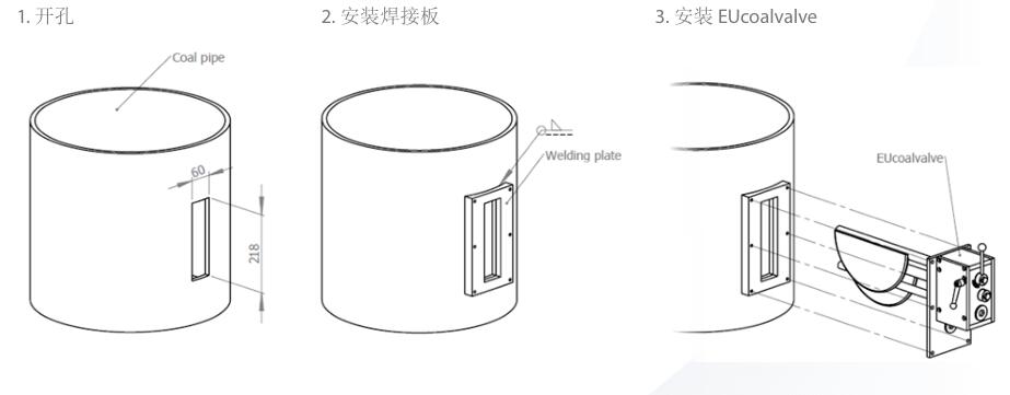 EUcoalvalve可安裝在煤粉管道周圍的每個位置。安裝只需三個步驟。