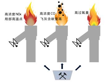 全部燃燒器空燃比控制系統能夠對燃燒的最關鍵參數 — 風煤比進行直接調節。只有保證正確的風煤比值,才能提高燃燒過程質量并降低排放如:CO、飛灰含碳量、NOx和粉塵等。更重要的是降低氧量的同時將提高熱效率。